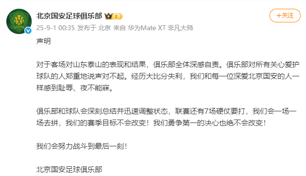 8月31日晚上,在2025年中国超级联赛的第23周期中,北京郭以0-6击败了山东·泰山(Shandong Taishan),结束了他连续三场对手的成功。该标记还创造了最高联盟中郭安(Guoan)差异最大的纪录。 9月1日清晨,@beijing Guoan足球俱乐部发表声明向粉丝道歉,并保证“决定首先要努力永远不会改变!”北京枪支俱乐部说,该俱乐部对其表现和对山东陶珊的成绩深感内gui。俱乐部真诚地对所有关心团队的人表示抱歉。经过巨大的得分损失,俱乐部很害羞,晚上无法入睡,因为每个人都非常喜欢北京公共。俱乐部和团队将做出深入的摘要,并迅速修复Kanijust州。在联盟中仍然有7场糟糕的战斗。我们将独自战斗,我们的目标不会改变!我们决定首先努力工作的决定将永远不会改变e! “我们将战斗直到最后一刻!”北京郭安俱乐部说。南方网络,广东学习记者Lu Shaocong