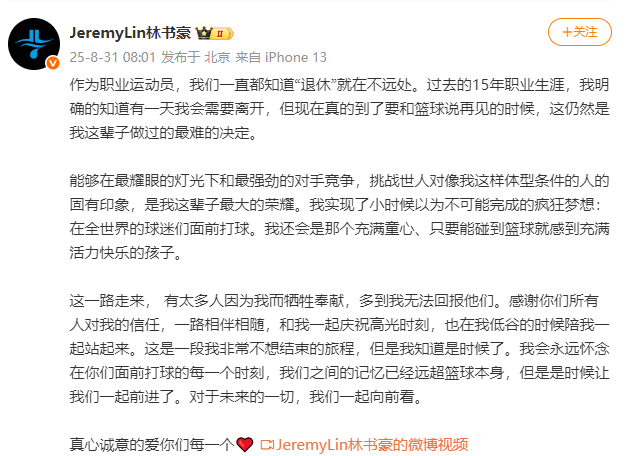 8月31日,杰里米·林(Jeremy Lin)通过他的微博帐户@jeremylin宣布退休。相关主题曾经引导热微博搜索列表,这会引起激烈的讨论。杰里米·林(Jeremy Lin)在文章中说,作为一名职业运动员,他总是知道“退休”并不遥远。他清楚地知道,有一天他将不得不离开,但是现在是时候对篮球说再见了,这仍然是他一生中做出的最艰难的决定。 “在令人眼花sight乱的光线下与最强大的对手竞争并挑战像我这样身体状况的人们的自然印象的能力是我一生中最大的荣誉。”他说,他意识到一个疯狂的梦想,他认为年轻时就无法实现:在世界各地的粉丝面前玩耍。小时候,这是一个孩子,充满了兴奋和幸福,您可以应付篮球。杰里米·林(Jeremy Lin)说,一路上,许多人牺牲了他们的奉献精神因为他,很多人无法付款。多亏了您对他的所有信任,您一直都在庆祝他的亮点,并与他站在一起。他说:“这是我真的不想结束的旅行,但我知道是时候了。我总是想念我在你面前玩的每一个时刻。我们之间的回忆不仅仅是篮球本身,但是现在是时候让我们一起前进了。对于将来的一切,我们希望在一起。我真诚地爱你们。”公共信息显示,杰里米·林(Jeremy Lin)于1988年8月23日出生于美国加利福尼亚州的帕洛阿尔托。他是美国职业球员NG篮球,担任控球后卫,毕业于哈佛大学,并为中国台北联盟的新台北国王职业篮球队效力。他于2010年在NBA联赛中首次亮相,并于2019年赢得了多伦多猛龙队的NBA冠军。2025年2月4日,NBA正式宣布了全明星新秀冠军的教练。Insiphip和Jeremy Lin被选中。南方网络,广东学习记者李