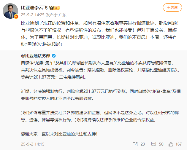 9月2日,@BYD法律事务部发布了一份关于违反自我媒体“ Dragon Pig-jiche”及其相关帐户的声明。比德说,自我媒体的“龙猪猪”及其相关帐户长期以来已经发表了有关BYD的大量错误和侮辱性的信息。第一次映射的判决决定造成违法行为,并命令被告道歉,删除违法的评论,并偿还比亚特的经济损失,总计为201.87亿元人民币;最初的判决被第二次提升。最近,在强迫法院实施法院后,执行了201.87亿元的赔偿金。同时,自助媒体“龙猪che”和相关帐户的实际控制道歉给Byd。比德说,我们始终尊重和派对的建议和行政管理,但互联网并不是一个无法无天的地方。诸如侮辱,八卦,涂抹等违规行为纽约形式,我们将继续使用法律方式来保护企业的合法权利和利益。随后,@byd li yunfei发表了一个回应:“ Byd达到了当前的位置和规模。如果有媒体报道并批评事实,那就可以了!
