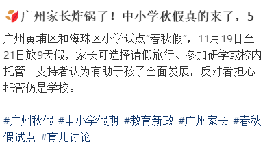 近日,网上流传“广州市黄埔区、海珠区小学将于11月19日至21日试行‘春秋假期’假期”的消息。为此,南方网、粤研记者向广州市教育局以及黄埔区、海珠区教育局求证。据悉,广州市教育局在《广州市2025-2026学年义务教育学校校历》中明确提出,“鼓励有条件的地区根据实际情况探索中小学放假和秋季的设置。相关安排应在本学期开学前报市教育局报到登记。”10月15日,广州市教育局相关工作人员 广州赛都市教育局向南方网及广东记者表示,经过总体规划,分析经各区向市教育局通报,广州市个别学校已完成秋季放假登记,其中黄埔区6所,花都区1所。放假的具体时间和安排,由学区根据学校计划综合研判制定。南方网、广东省记者进一步向黄埔区、海珠区教育局求证。截至发稿,相关工作人员回应称,黄浦区、海珠区中小学尚未对“春秋假期”作出具体安排。出版社将持续跟进并及时发布相关消息。南方网广东考察记者 刘善艳 何敏慧
