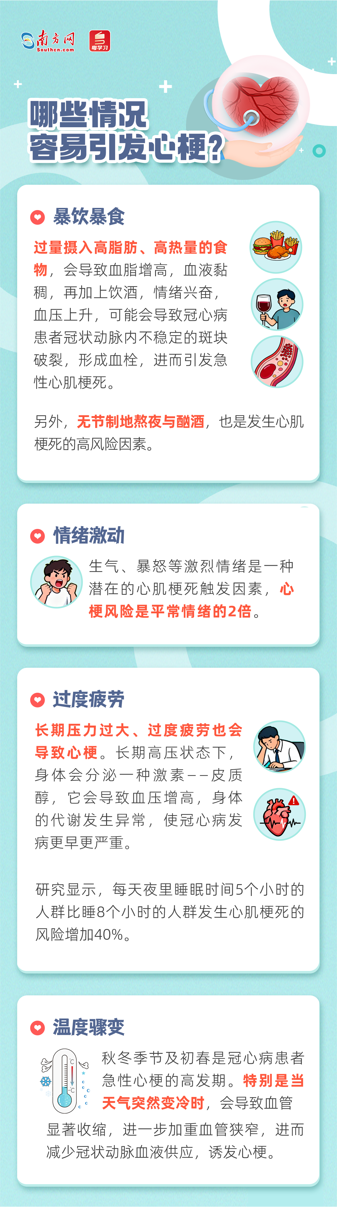 冷了就会“杀人”!寒潮将至,急性心肌梗死将进入高发期。心肌梗塞不仅威胁老年人。近年来,心肌梗塞发生的年龄不断降低,年轻人也需小心。心肌梗塞发生前的早期症状有哪些?学会识别身体的求救信号可以在关键时刻挽救生命。让我们来看看。统筹:李婷 策划:叶丽子 设计:林若云 校对:赖雨晴
