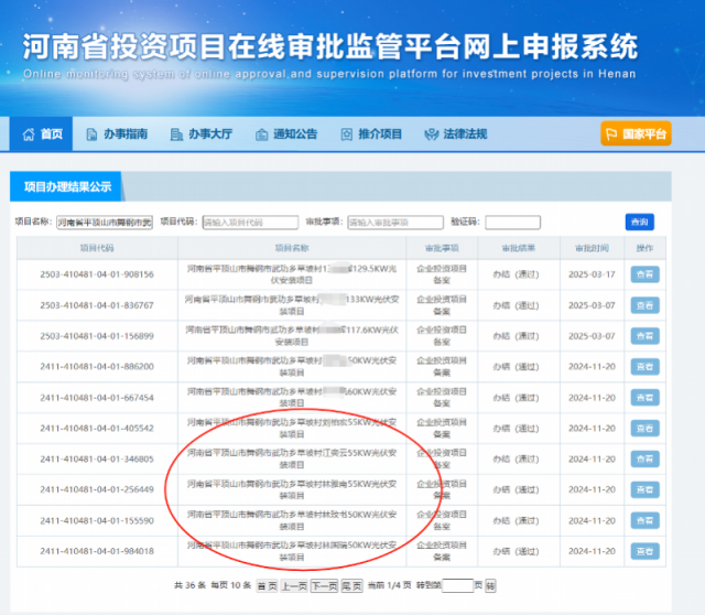 近日,有网友称,河南省平顶山市舞钢市某村多个光伏安装项目出现“最忙五人”。安装光伏的村户姓名被覆盖在百度姓名库中。此前,南都报道称,他在查询河南省投资项目网上审批管理平台时发现,河南省平顶山市武钢市武功乡草坡村村民光伏安装项目中,多个安装光伏的村户姓名在百度网姓名库中出现重合。 “刘柏宏、蒋依云、林亚男、林敏舒”等“最忙五人”再次出现。 12月11日,舞钢市人民政府办公室通报称,舞钢市高度重视有关部门举报的“舞钢光伏安装项目公开信息”相关问题。并正在迅速向媒体通报情况并进行核实。经初步核实,舞钢市培辉太阳能发电有限公司成立于2024年3月28日,为私营企业。该公司于2024年11月20日在河南省网上审批管理平台注册户用屋顶光伏项目,涉及“林国瑞、林敏树”等10名村民的信息为虚假信息。该项目备案后并未实际实施。舞钢市发改委正在会同相关单位对公司所有注册项目进行全面排查,并将根据情况做进一步处理。